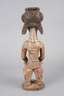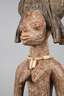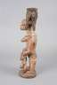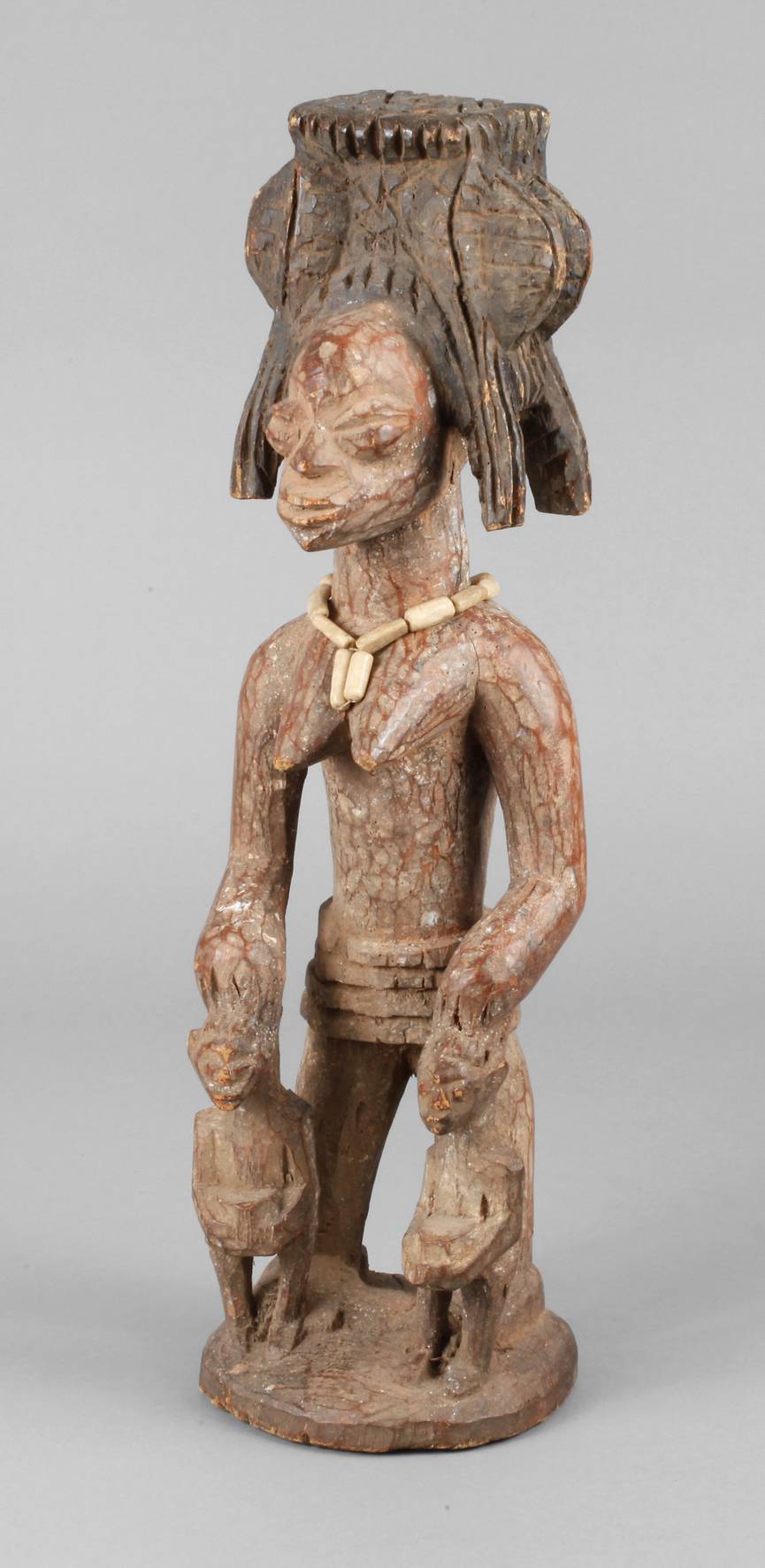 den Yoruba zugeordnet, Tropenholz beschnitzt und braun eingefärbt, Darstellung einer Mutter mit zwei Kindern, einen vierbeinigen Hocker auf dem Kopf und eine Beinperlenkette tragend, beide Hände auf den Köpfen der Kinder, welche einen Gegenstand in den Händen halten, auf gewölbter Plinthe stehend, H 51 cm.