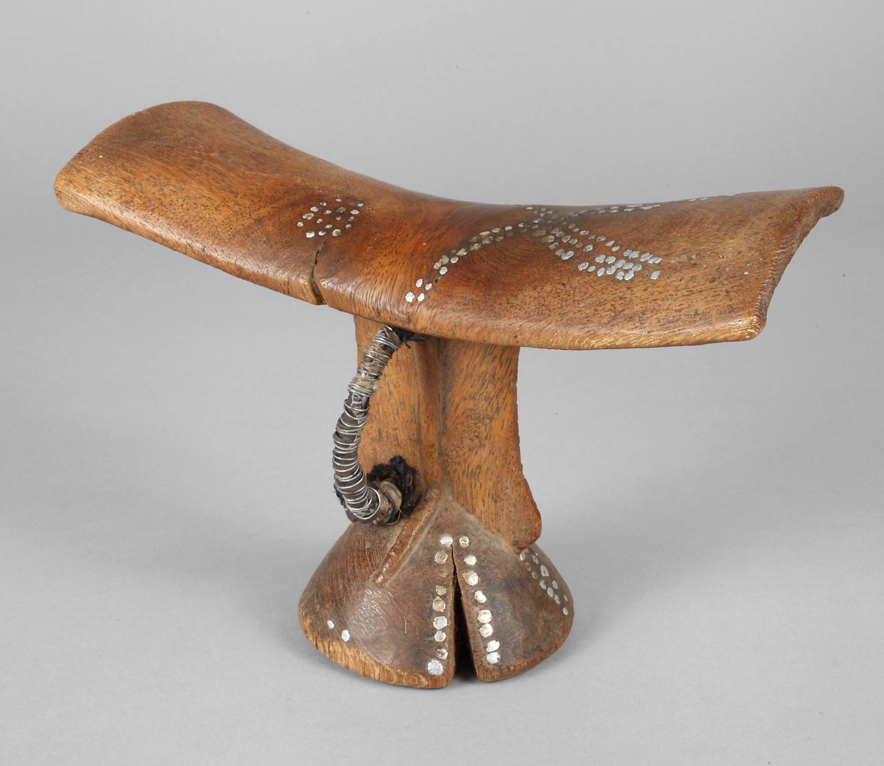 1. Hälfte 20. Jh., feine Teakholzschnitzarbeit der Makonde, mit Beschlägen verziert, leichte Gebrauchsspuren, L 27 cm, H 18 cm.