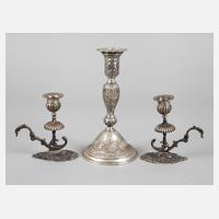 wohl Ende 19. Jh., Metall versilbert, ungemarkt, zwei Nachtleuchter mit Handhabe, der andere mit Rosenblüten und Rocaillen verziert, Gebrauchs- und Altersspuren, H 12 und 20 cm.