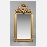 um 1860, Stuck goldbronziert, üppige Bekrönung mit zwei Putten und Blütenbukett, originales facettiertes Spiegelglas, Vergoldung erneuert, partiell bestoßen, kleinere Fehlstellen, restaurierungsbedürftig, H 110 x B 60 cm.