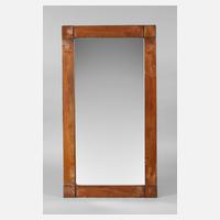 um 1915, Kirschbaum auf Nadelholz furniert, Kopf und Sockel durchbrochen gearbeitet, fein ausgesägte ebonisierte Ornamente, originales facettiertes Spiegelglas, ein Segment im oberen Ornament fehlt, H 110 x B 60 cm.