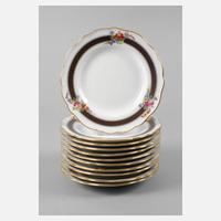 unterglasurblaue Knaufschwertermarken 1860–1924 bzw. siebenmal Pfeifferzeit 1924–1934, 1. Wahl, Präge- und Pinselnummern, Form ”Neuer Ausschnitt”, umlaufende Goldbordüre über kobaltblauem Fond, mit drei aufliegenden Blütenbuketts in feiner polychromer Aufglasurmalerei, Goldränder, ein Teller bestoßen, D 25 cm.