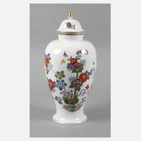 unterglasurblaue Schwertermarken nach 1934, 1. Wahl, Präge- und Pinselnummern, Deckelvase in Balusterform mit unterglasurblauem Aquatintadekor aus goldstaffiertem Blütenbukett und Insekt, dazu kleine bauchige Vase mit ”Blume 1” in polychromer Aufglasurmalerei, Goldrand der kleinen Vase berieben, H 24,5 und 6 cm.