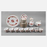 für acht Personen, unterglasurblaue Schwertermarke Pfeifferzeit 1924–1934 bzw. einmal 1860–1924 und nach 1934, 1. Wahl, Präge- und Pinselnummern, Form ”Osier”, mit korallroter Camaieumalerei und Goldpunkten, bestehend aus Kernstück und acht Gedecken, Kaffeekanne und Sahnegießer minimal bestoßen, H Kanne 26 cm.