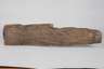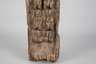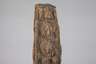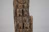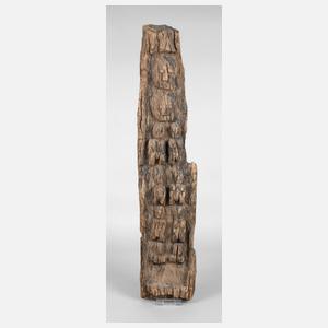 grob herausgeschlagenes Pfostenstück aus Eisenholz, nussbaumfarben, mit dunklen Krustierungsresten, vertieft herausgearbeitet mit Einfassung, Darstellung der Köpfe der Eltern sowie die Körper von sechs Kindern, naive Arbeit eines Laien, stärker verwittert, Fehlstelle an der Einfassung, die Verwitterung des Holzes lässt auf ein hohes Alter schließen, H 78 cm, B bis 17 cm.