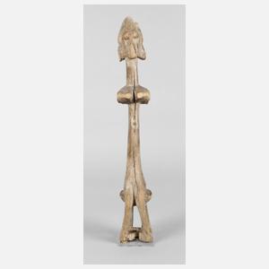 Zentralsudan, südöstlich des Bene, Teakholz beschnitzt, hohe, stark symbolisierte Darstellung einer auf einem Hocker sitzenden Frau, schlanker Körper und Hals, die Frisur bis an den Hals reichend, Füße und Arme fehlen, Fehlstelle an den Haaren rechts, vermutlich sehr hohes Alter (genaue Datierung nicht möglich, da Teakholz fast nicht verwittert), H 44 cm.
