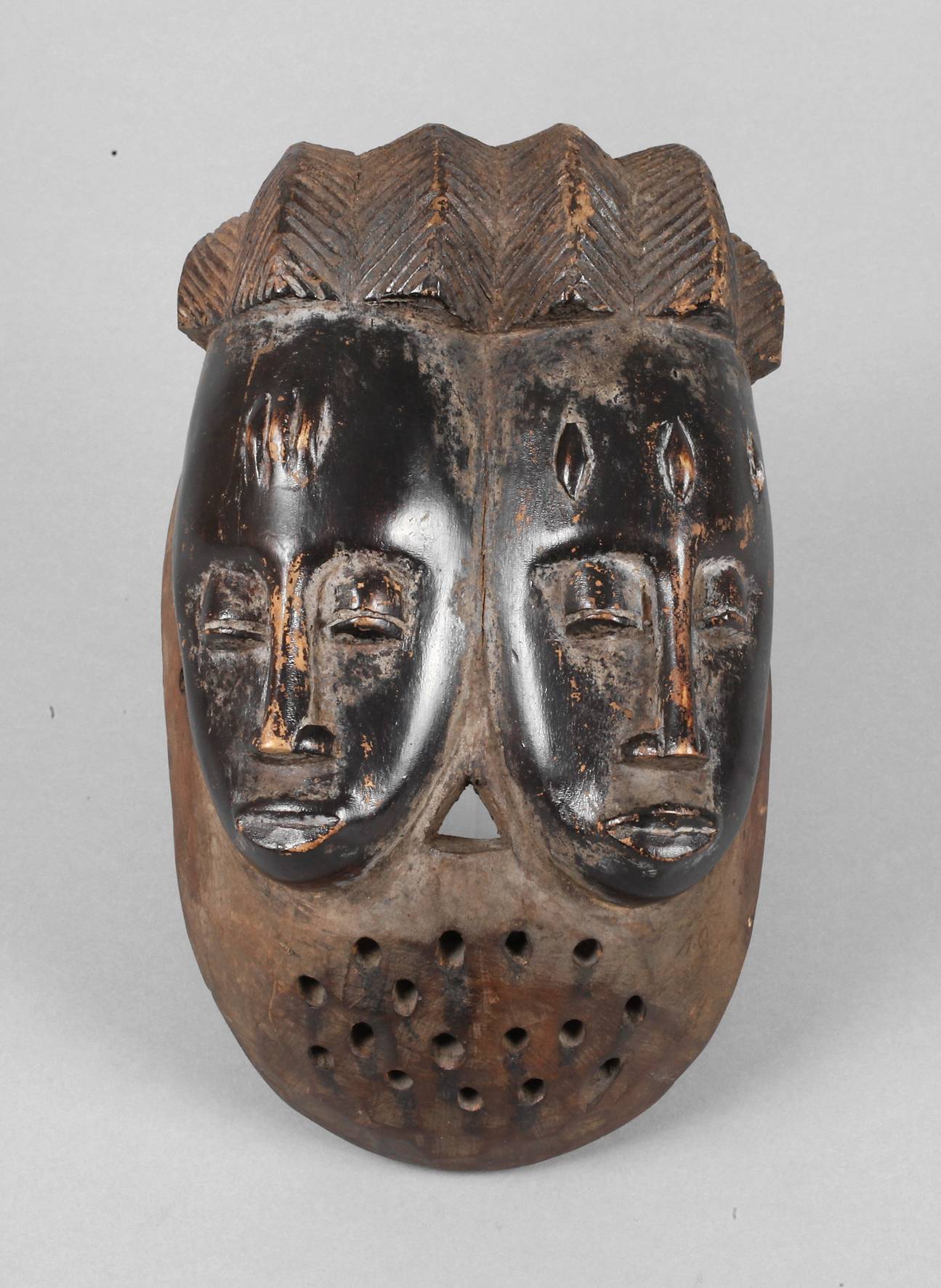 schwarz gefärbtes Tropenholz, in Art eines Januskopfes gearbeitet, hohe Haartracht, Stirntatauierungen, nicht tragbar, H 23 cm.