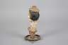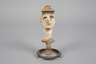 Zaire, der Jonga, einer kleinen Volksgruppe der Mongo, zugeschrieben, farbig staffiert, mit einer Kopfkappe, wohl dazugehörig geschnitzter Holzring, Nase etwas bestoßen, alter Anobienbefall, altersgemäß gute Erhaltung, H 16 cm.