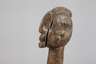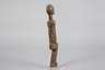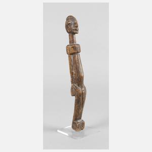 leichtes Tropenholz mit fleckiger Patina, naive, einfache Darstellung eines Mannes, Beine als eine Einheit und extrem schmaler Kopf, H 26 cm.