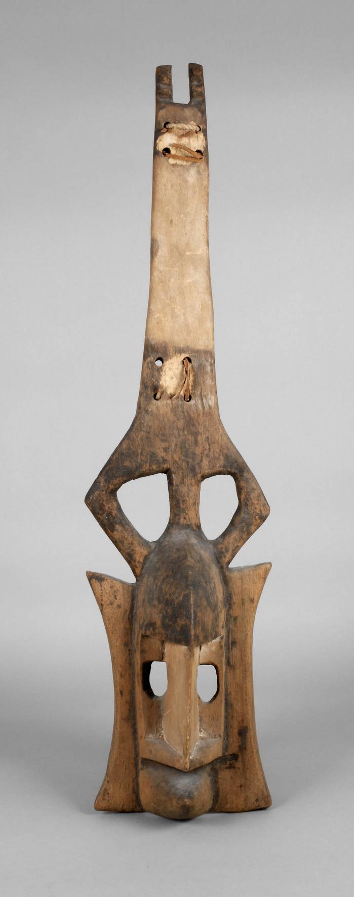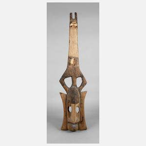 Mali oder Elfenbeinküste, der Volksgruppe der Senufo zugeschrieben, gefertigt aus eingefärbtem Limbaholz, teilweise krustiert, Maske verbindet zwei Typen: Nwen-kafuru (Brettaufsatz) und Molo (Maske), sehr ausdrucksstark, mit schmalem, vorstehendem Gesicht, das Kinn als langer spitzer Kegel, bis zur Nasenspitze vorstehend, der sich nach oben verjüngende Aufsatz von drei Stützen getragen, ehemaliger Bezug fehlt, zwei kleinere Ausbrüche hinten, sonst altersgemäß gute Erhaltung, H 88 cm.