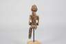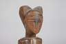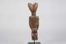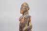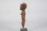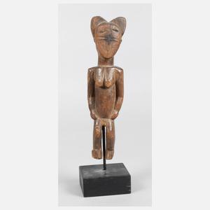 tropisches Hartholz mit brauner Patina, weibliche Darstellung, mit markanten Gesichtszügen und zweigeteilter Haartracht mit Netz, wurde ohne Arme gefertigt, Witterungsschaden an der rechten Fußsohle, linker Fuß fehlt, H 37 cm.