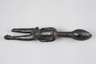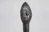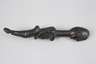dunkles Mahagoniholz, mit Resten eines Graphitüberzugs, Darstellung einer Frau mit überlangem Hals und vor dem Körper vereinten Händen, Füße und eine Hand fehlen, sonst gute Arbeit, ohne Stützhilfe, H 25 cm.