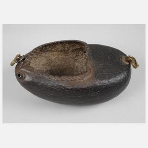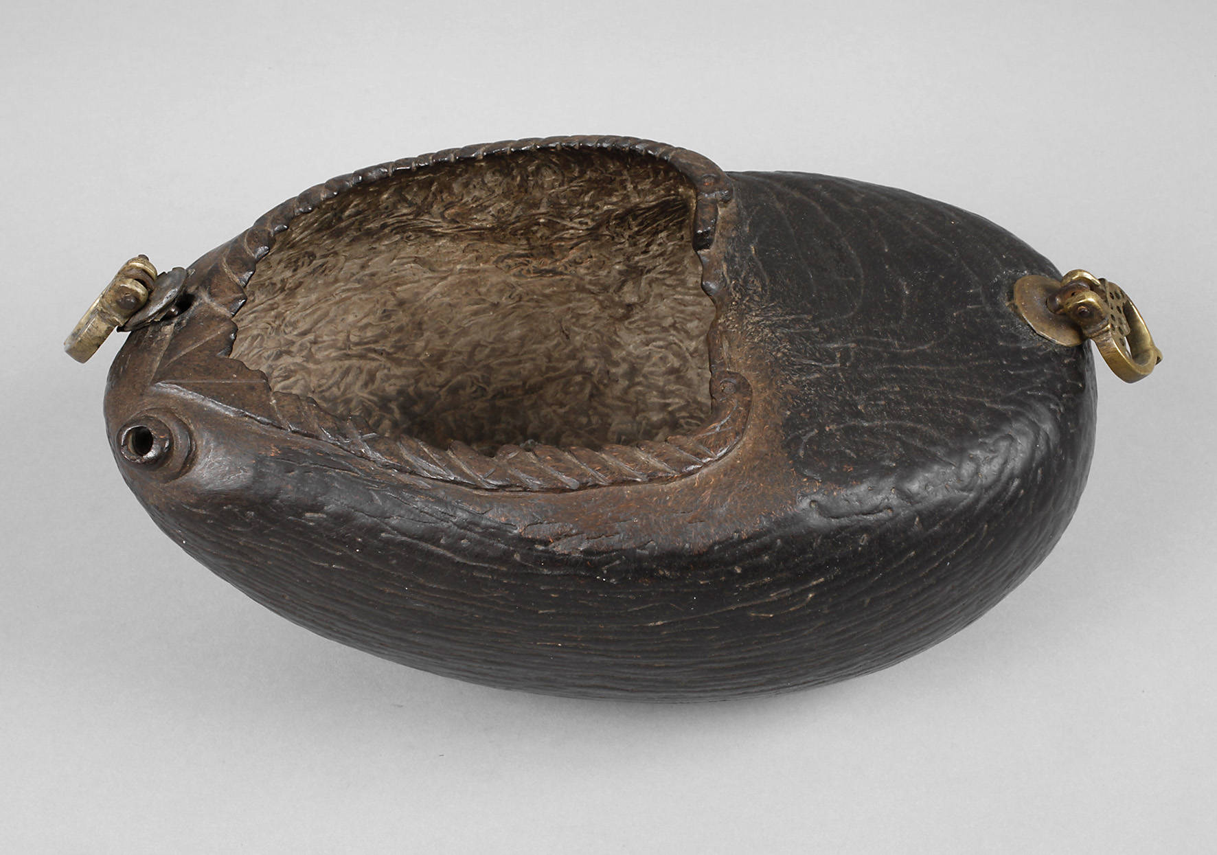 Ostafrika, um 1900, sogenannte Kashkul, aus der Hälfte einer Coco de Mer gefertigt, partiell beschnitzt, Bronzebeschläge, ursprüngliche Gliederkette fehlt, L 24 cm.