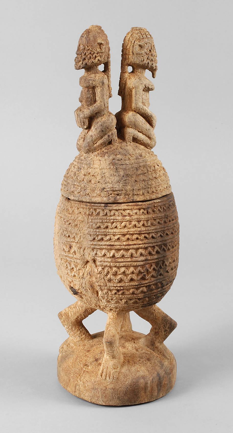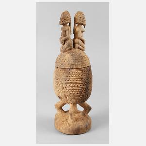 wohl Kamerun, Teakholz aufwendig beschnitzt, eiförmiger Korpus mit umlaufendem Kerbschnittdekor, auf vier geknickten Beinen, auf gewölbter Plinthe stehend, auf dem Deckel vollplastisch gearbeitetes Paar, Deckel abnehmbar, H ges. 37 cm, B ca. 13 cm.
