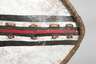 altes Schild mit neuen Farben, weiß gefasst, mit schwarzen und roten Verzierungen, die Kanten aus ledergebundenen Holzstäben, Holzgriffleiste mittig, Maße ca. 120 x 60 cm.