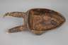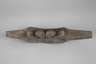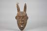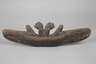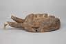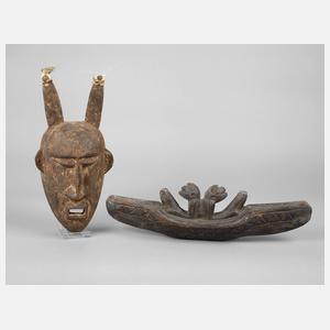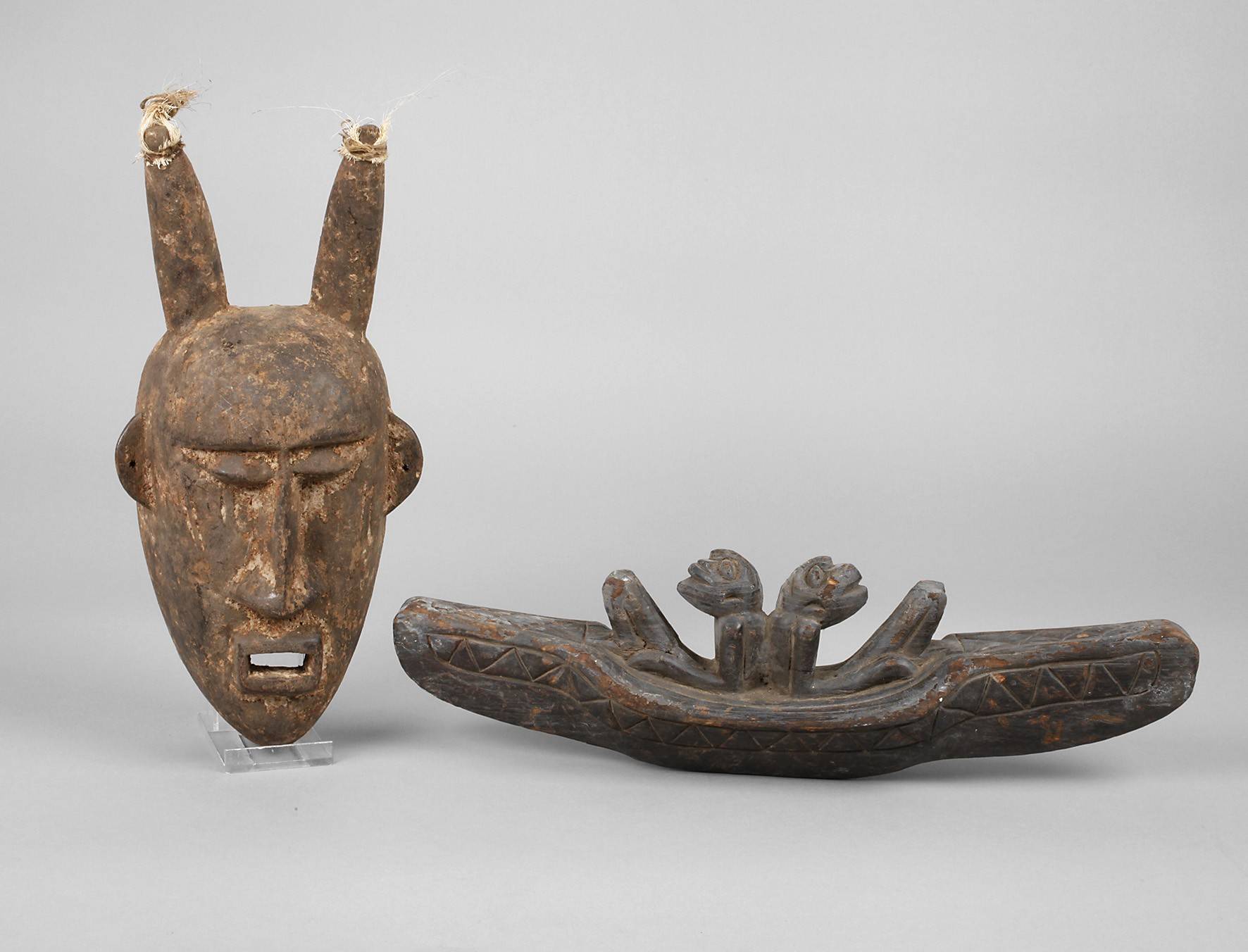 kleine, stark krustierte Wandmaske mit zwei Hörnern, ehemals gekalkt, Reste von Haarpinseln an den Spitzen, vermutlich Arbeit der Baule, Elfenbeinküste, H 32 cm, dazu Geisterboot aus hartem, eingefärbtem Tropenholz, zwei am Rücken aneinanderlehnende Wesen, in einem Kahn sitzend, Herkunft nicht zugeordnet, L 40 cm.