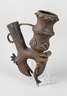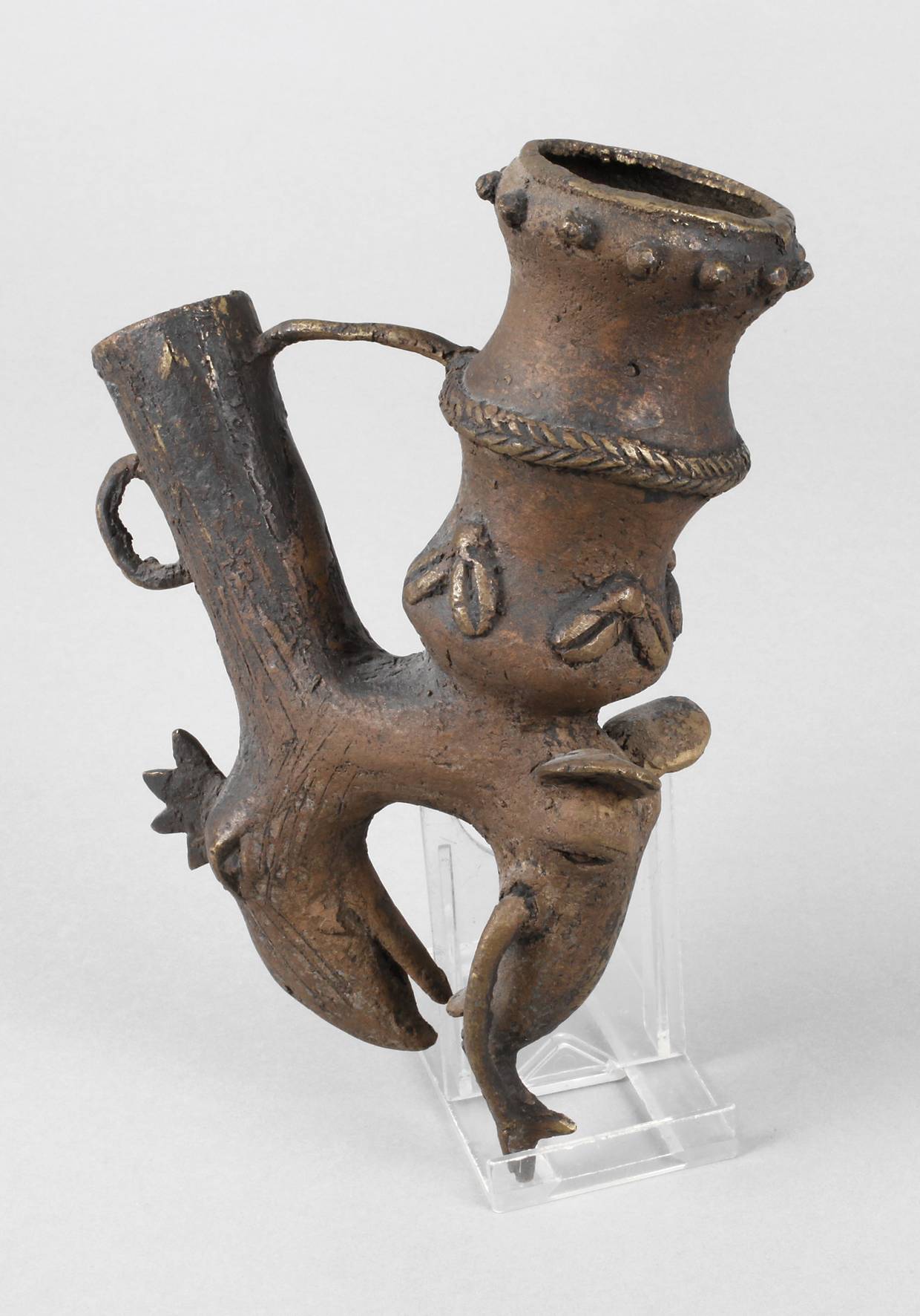 Bamum, Kameruner Grasland, unbest. Alters, Bronze in der verlorenen Form gegossen, kunstvoll gearbeitete Pfeifenköpfe standen nur hohen Würdenträgern und Mitgliedern von Geheimbünden zu, figürlich gestalteter Pfeifenkopf mit vollplastisch gearbeitetem Elefanten und Vogelhaupt, Altersspuren, L 21 cm.