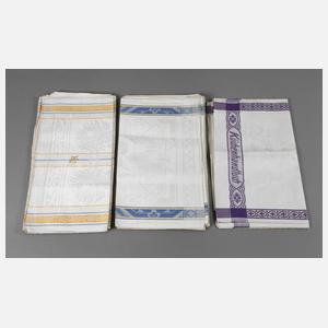 1920/30er Jahre, cremefarbener Halbleinendamast mit eingewebten Farbbordüren, bestehend aus zwölf Art déco-Tüchern mit Rosenmotiv, sechs Tüchern mit Chrysanthemenblüten und gesticktem Besitzermonogramm JR in Gelb sowie fünf Gebilddamast-Küchentüchern mit Bezeichnung und gespiegeltem Stillleben aus Küchenwaage, Gans und Gemüse, alle unbenutzt, vereinzelt leicht angestaubt, Maße max. 110 x 47 cm (12 x).