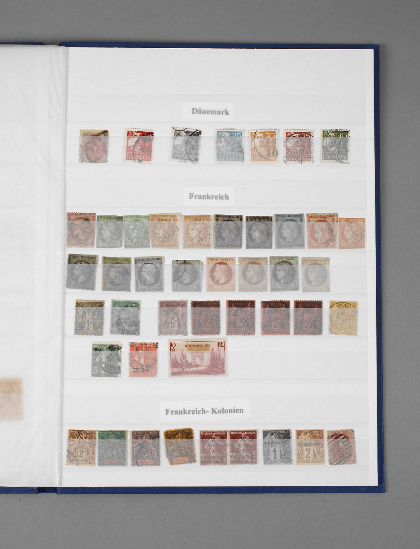 ab 1870, Steckalbum mit teils klassischen Markenanteil, meist Europa (Frankreich, Niederlande, Norwegen, Portugal, Russland), über Mauritius, Süd-Wales, Ägypten bis Hongkong, Shanghai und China.