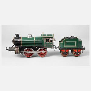zum Herrichten, um 1910, gemarkt, Blech grün-schwarz lackiert, Spur 1, Achsfolge B, Uhrwerksantrieb intakt, vor- und rückwärtsfahrend, Handschaltung und Galeriestangen, dazu passend ergänzt zweiachsiger Tender mit Kohle, laienhaft übergangene Farbfassung, L Lok 20 cm, L gesamt ca. 33 cm.
