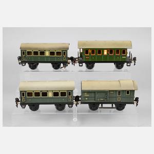 Bauzeit 1947–1954, gemarkt und bezeichnet, Blech lithogr., grün, Spur 0, bestehend aus zwei Personenwagen 1725 und Gepäckwagen 1726, dazu Personenwagen 1727 mit Plattform, alle zweiachsig, mit durchbrochenen Fenstern, beweglichen Türen und hellen Puffern, zwei in orig. Karton mit Firmenetikett (ein Deckel fehlt), min. Alters- und Gebrauchsspuren, ein Wagen nachträglich elektrifiziert, L je 16,5 bzw. 18,5 cm.
