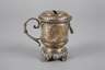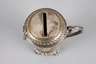 Ende 19. Jh., ungemarkt, Messing reliefiert und versilbert, zylindrische Wandung mit Volutenhenkel und eingezogenem Rundfuß über Rocaillensockel, beidseitig freie Rocaillenkartusche, Scharnierdeckel mit Münzschlitz, Bügelverschluss und Vorhängeschloss, ohne Schlüssel, Versilberung berieben, H 9,5 cm.