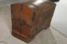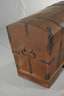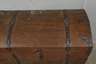Eiche massiv, Ende 18. Jh., Runddeckeltruhe mit Zierbändern aus Schmiedeeisen, Füße auf Rollen gelagert, Schloss fehlt, Deckel mit Trocknungsrissen, Altersspuren, H 86 x B 117 x T 63 cm.