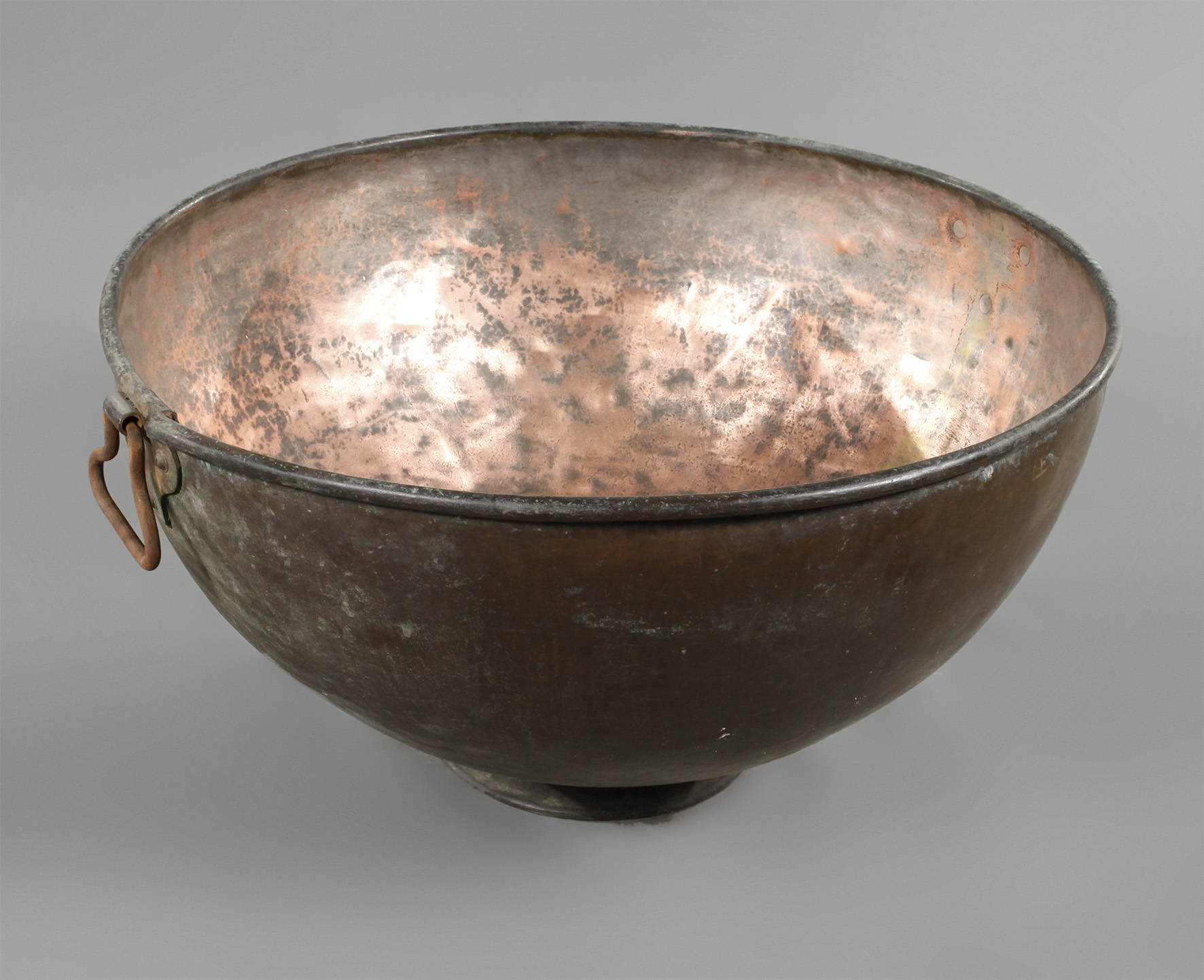 18./19. Jh., Kupferblech getrieben, Henkel aus Eisen, mit Standring, am Henkel kurzer Einriss, Alters- und Gebrauchsspuren, H 40 cm, D 72 cm.