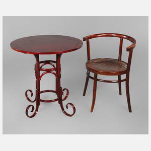 gemarkt Jacob & Joseph Kohn, Wien, um 1910, Buchenbugholz rotbraun gebeizt, Armlehnstuhl mit rundem Sitz aus geprägtem Schichtholz, Tisch mit aufwendig verziertem Gestell, beides wohnfertig restauriert, Maße Tisch H 74, D 72 cm.