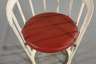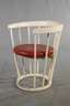 wohl 1960er Jahre, Buche massiv, cremefarben lackiert, konischer Stuhl mit runder Sitzfläche und umlaufender Lehne, Sitzfläche mit originalem roten Kunstleder, dieses mit kleinem Einriss, sonst guter Originalzustand, H 74, D 60 cm.