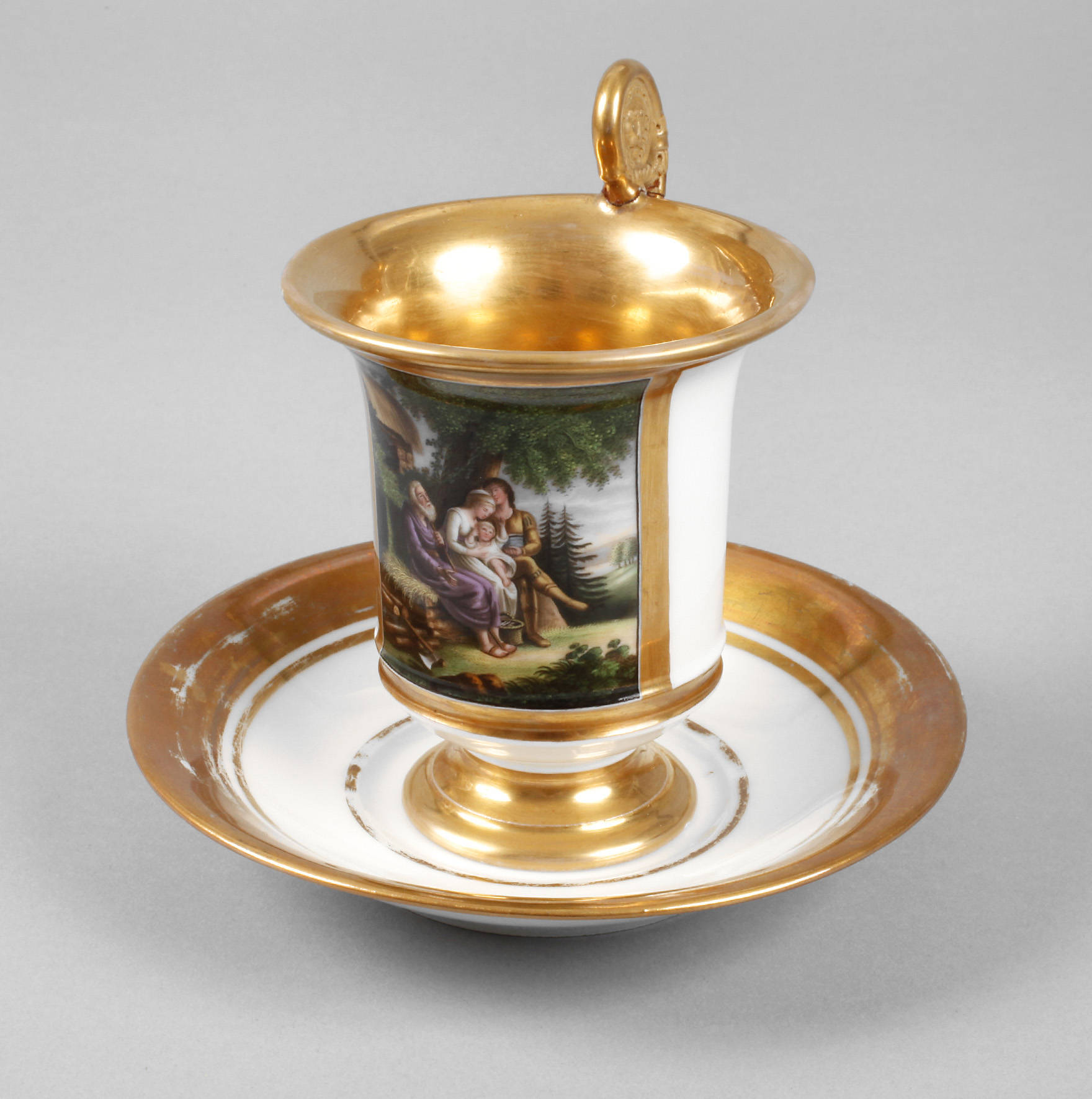um 1840, Ritzzeichen X bzw. III, glockenförmige Tasse mit hochgezogenem Löwenkopfhenkel und Vergoldung, schauseitig rechteckige Goldreserve mit Darstellung einer jungen Familie, mit bärtigem Mann, vor einer baumbestandenen Hütte in feiner polychromer Aufglasurmalerei, Untertasse passend ergänzt, Vergoldung dieser berieben, Henkel geklebt, H gesamt 12,5 cm.