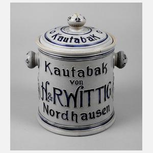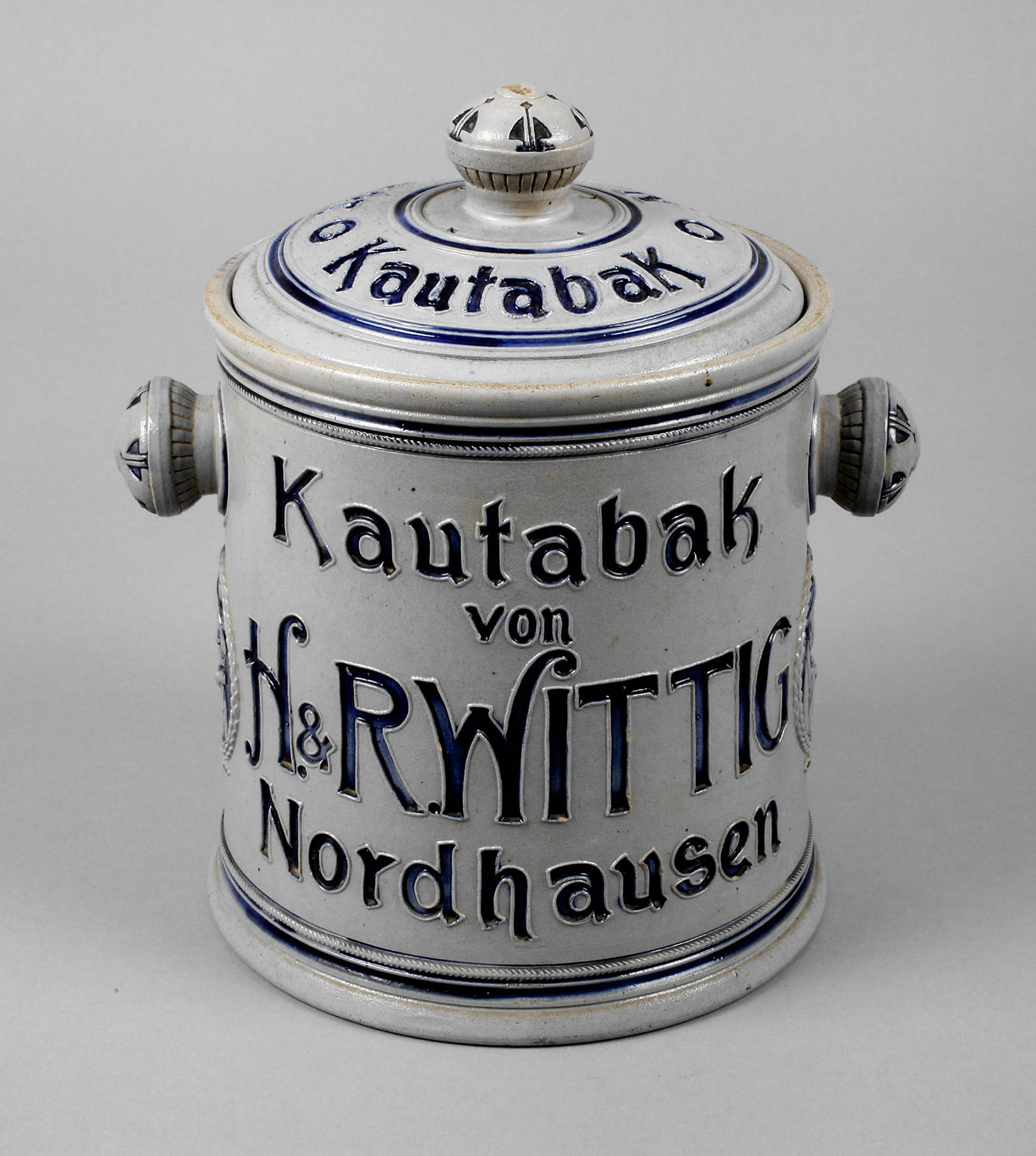 um 1910, Herstellermarke J. W. Remy Höhr, graues Steinzeug salzglasiert, reliefiert und kobaltblau bemalt, Werbeaufschrift Kautabak von H. & R. Wittig Nordhausen, zwei seitliche kugelige Handhaben, darunter Herrenportraits, restaurierter Haarriss, Deckel innen unbedeutend bestoßen sowie eine oberflächliche Fehlstelle am Deckel, H 24 cm.