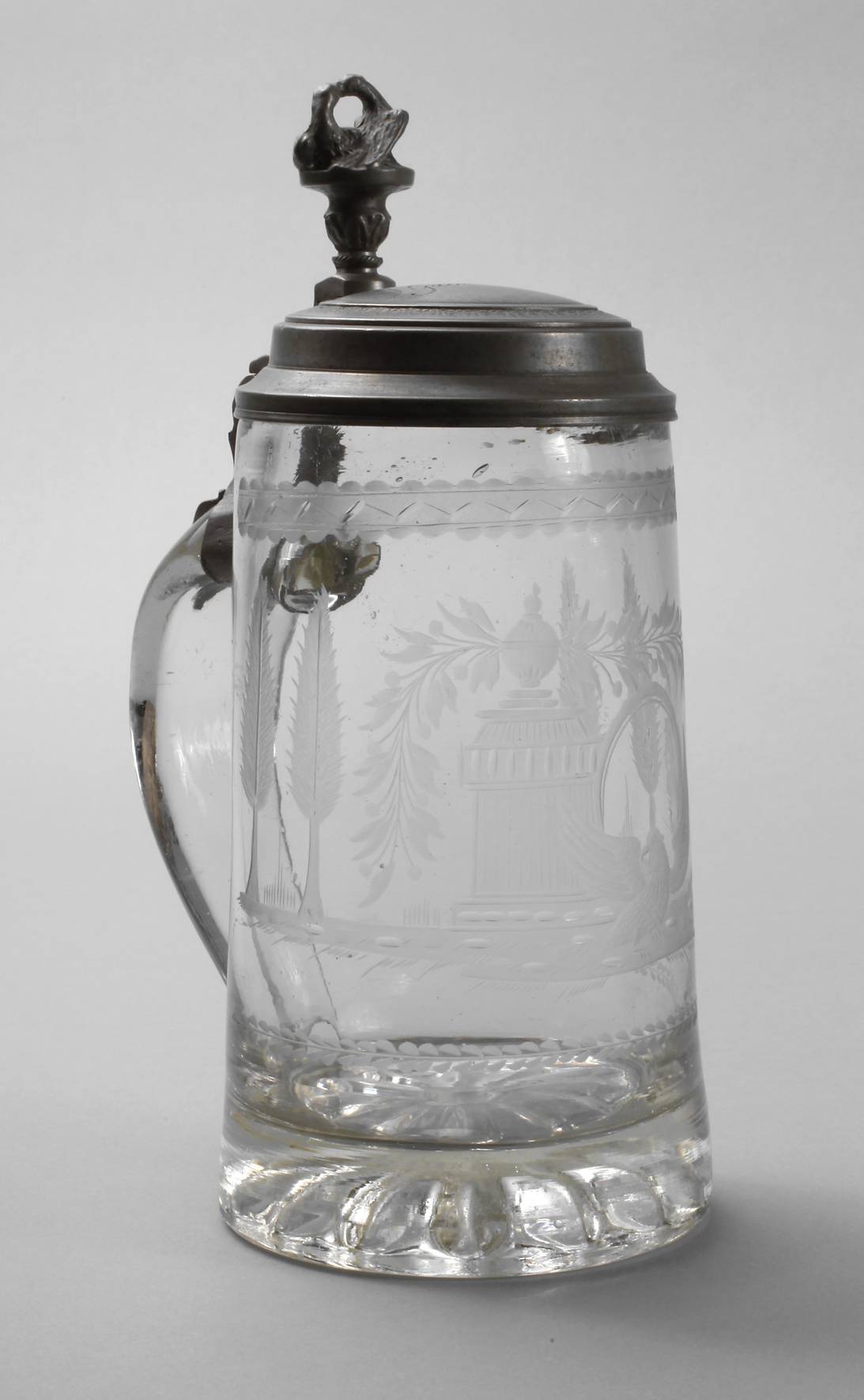 um 1800, farbloses, leicht blasiges Glas, formgepresst, angesetzter Bandhenkel, feiner Mattschliffdekor mit Säule und Taube zwischen Lorbeerranken, seitlich Bäume, Ornamentbänder, Zinndeckel mit zwei sich küssenden Täubchen als Drücker, gravierter Besitzername J. Gruntsteiner, Deckel etwas locker, sonst guter altersgemäßer Zustand, H 20 cm.