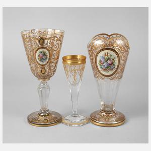 Ende 19. Jh., Vase und Pokalvase zusammengehörig, dazu ein Trinkglas, alles mit reicher Goldmalerei verziert, zwei Kuppen mit Blütenbuketts in ovalen Kartuschen, etwas berieben, die Vase mit kleiner oberflächlicher Fehlstelle innen am Rand, H max. 25,5 cm.