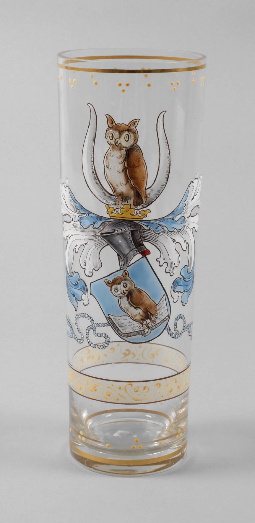 wohl Fritz Heckert/Petersdorf, um 1890, farbloses Glas, plangeschliffener Stand, fast zylindrisch, mit reicher opaker Emailbemalung, Eulenmotive und umlaufende Ornamentbänder sowie Goldreifendekor an Stand und Mündung, guter altersgemäßer Zustand, H 27,5 cm.