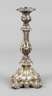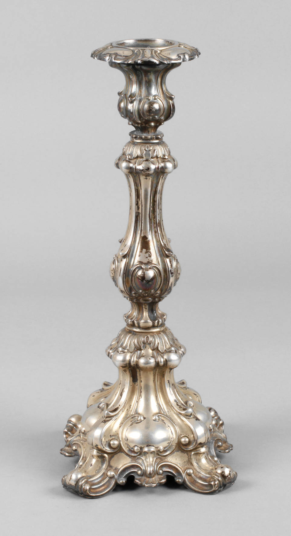 Mitte 19. Jh., gestempelt 13 Lot, fein getriebener, hohl gearbeiteter Leuchter, reich ornamental verziert, auf den Blättern fein ziseliert, feststehende Tülle, guter Zustand mit normalen Altersspuren, H 31,5 cm, G ca. 312 g.