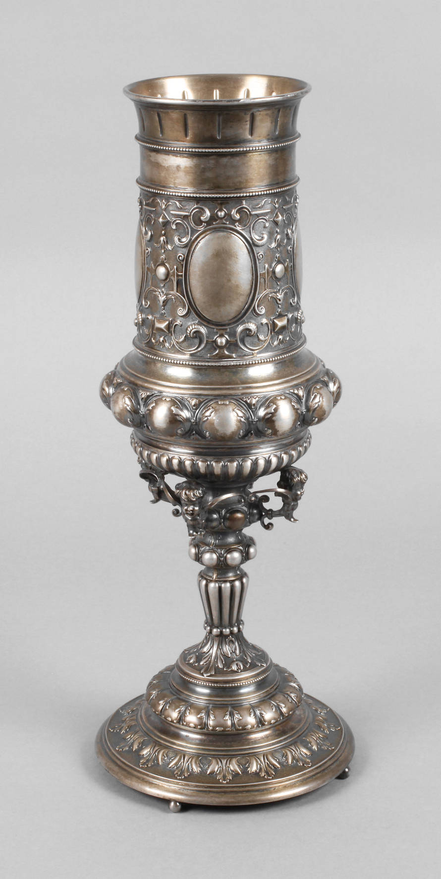 um 1870, gestempelt Halbmond, Krone, 800, Herstellermarke Koch & Bergfeld Bremen, Modellnummer N 6742, fein getrieben und ziseliert, auf vier kleinen Kugelfüßen stehend, gerippt und gebuckelt, verziert mit Akanthusblättern, Rollwerk, Blüten und Ornamentik, am Schaft vier Engelsköpfe, durch Flügel verbunden, innen Reste alter Vergoldung, Deckel fehlt?, H 40 cm, G ca. 876 g.