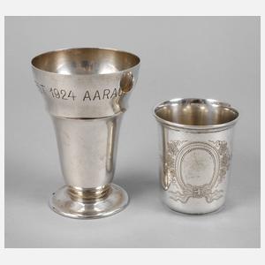 einer um 1860, gestempelt 13 Lot, mit fein gravierter, floral verzierter, offener Monogrammkartusche, der andere 1924, gestempelt 800, ungedeutete Herstellermarke, ”Eidgenössisches Schützenfest Aarau”, beide innen mit Resten alter Vergoldung, eine kleine Delle, H 7 und 10 cm, G zusammen ca. 139 g.