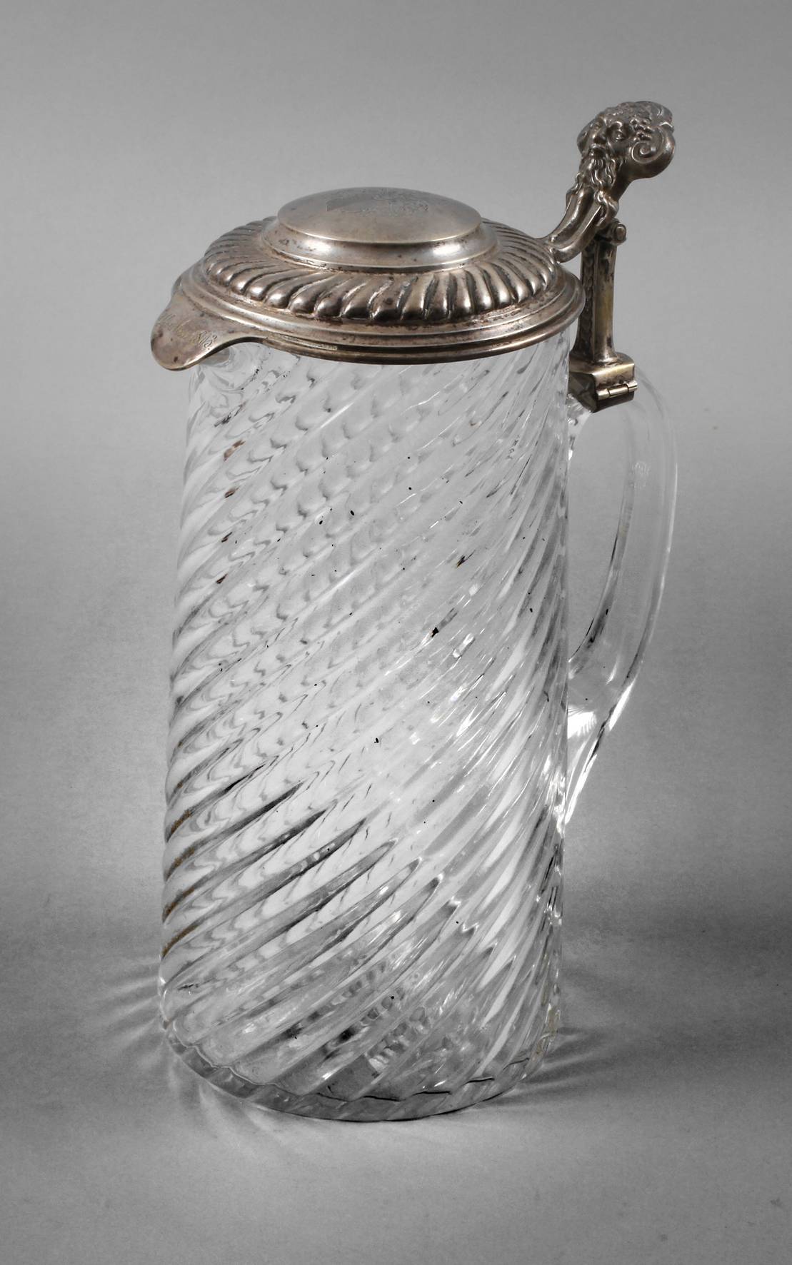 um 1890, hoher godronierter, leicht konischer Korpus mit Ausguss, Silbermontur, auf dem gerippten Deckel in feinster Gravur das Wappen derer von Watzdorf, der Drücker als bärtiges Männergesicht, Gravur ”14. Mai 1893” an der Schnaupe, aus dem Nachlass von Werner von Watzdorf (1895–1902, sächsischer Finanzminister), normale Alters- und Gebrauchsspuren, H ges. ca. 25 cm.