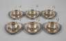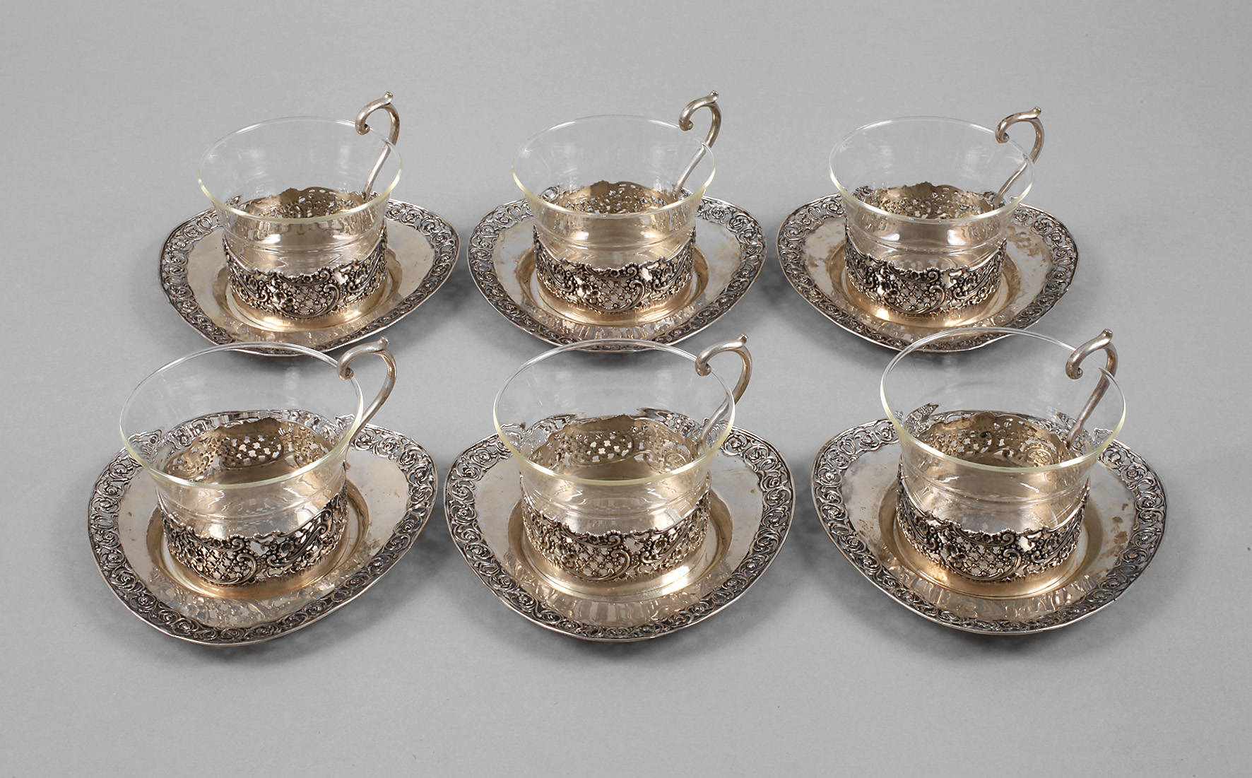 Mitte 20. Jh., gestempelt 800, Herstellerpunze CW, dreipassige Untertassen mit durchbrochen gestaltetem Rosenrand, dazu sechs Halterungen mit Gitterdekor, Rocaillenmotiven und Rosenranken, Einsätze aus farblosem Glas, gemarkt Schott & Gen. Mainz, H Teeglashalter 7 cm, G der Silberteile ca. 772 g.