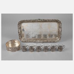 Mitte 20. Jh., gestempelt 800, Tablett mit Herstellermarke WS im Kreis, dazu ein runder Weinflaschenhalter und sechs Schnapsbecher mit Glaseinsätzen, normale Altersspuren, L Tablett 30,5 cm, G ohne Einsätze ca. 625 g.