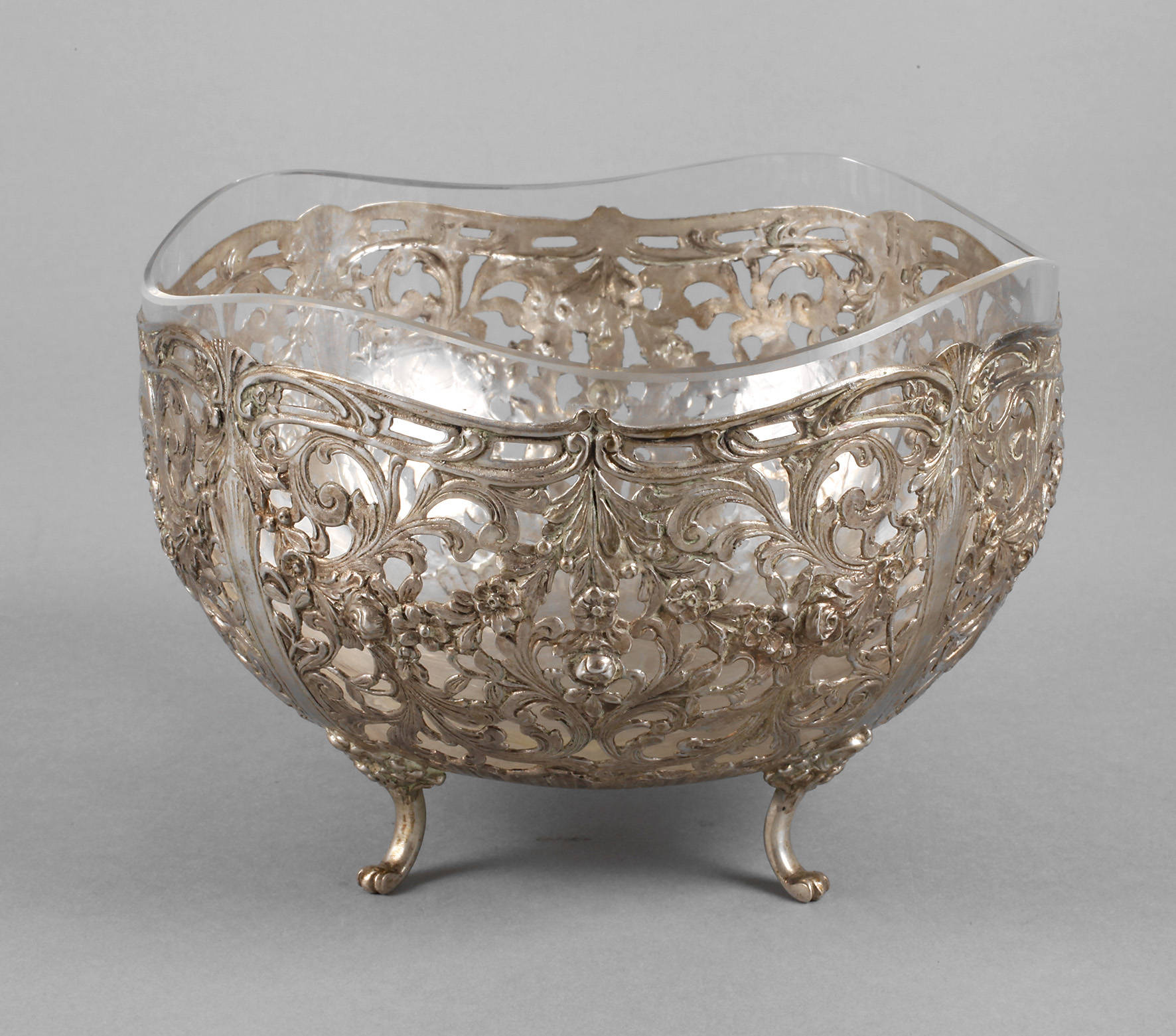 1950er Jahre, gestempelt 800, Herstellermarke WS im Kreis, auf vier schlanken Tatzenfüßen stehend, runde, durchbrochen gestaltete Form mit Blattwerk und Rosenfestons dekoriert, herausnehmbarer Glaseinsatz, guter Zustand, D 18 cm, G ca. 354 g.
