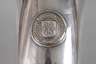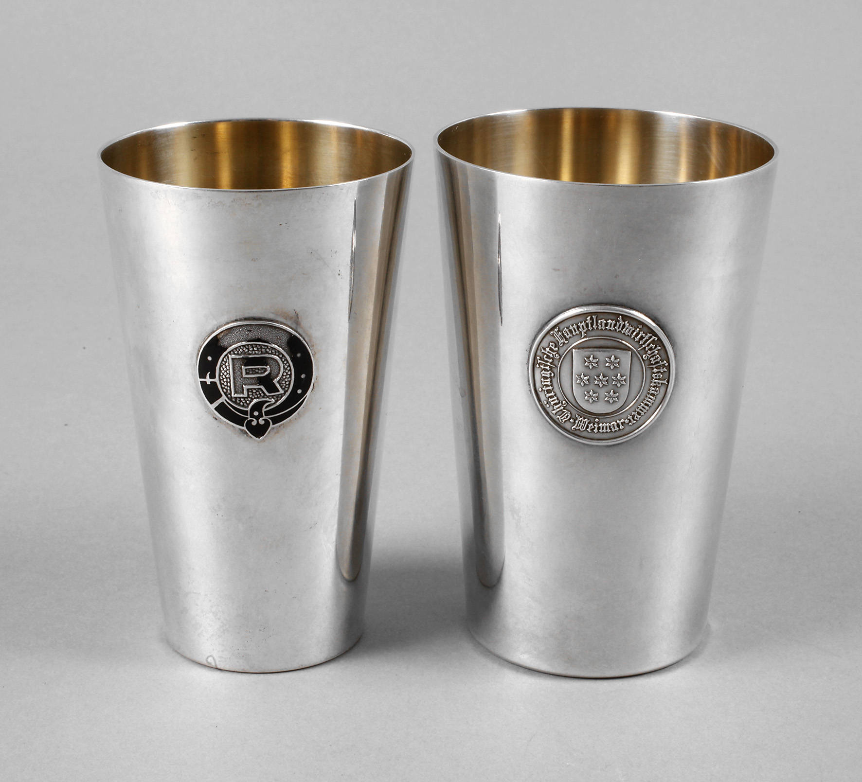 20. Jh., einer Thüringische Hauptlandwirtschaftskammer Weimar, rückseitig Gravur Reit- und Fahrturnier Schleiz 1942, gestempelt Halbmond, Krone, 835, Hersteller Wilhelm Binder/Schwäbisch Gmünd, Vertriebsstempel Theodor Müller, der andere emailliertes R im Kreis, gestempelt Halbmond, Krone, 800, Herstellermarke S im Oval, konische, innen vergoldete Becher, Email nicht komplett, H 11 und 11,5 cm, G zusammen ca. 225 g.