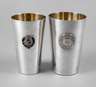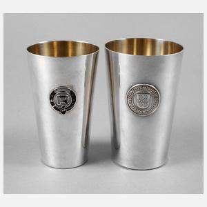 Zwei Silberbecher mit Werbeemblem