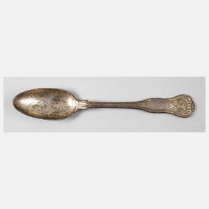 Mitte 19. Jh., gestempelt 12 Lot, Vertriebsstempel Leiritz, das Griffende mit reliefiertem bekrönten Wappen graviert, Laffe mit Resten alter Vergoldung, normale Altersspuren, L 22,5 cm, G 97 g.
