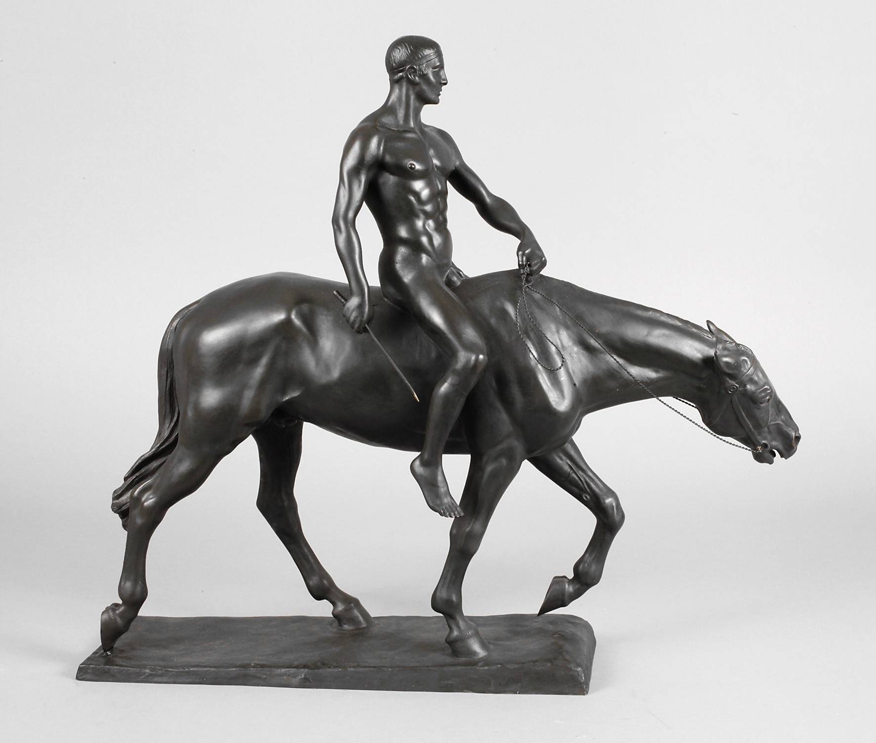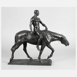 um 1920, auf der Plinthe signiert A. Hinr. Hussmann W.N., Bronze in dunkler, matter Patina, klassizierende Darstellung eines stolzen unbekleideten Recken zu Pferde, in der rechten Hand eine kurze Lanze haltend, die andere locker an die Zügel gelegt, gute Erhaltung, L 59 cm. Künstlerinfo: auch Hußmann, deutscher Bildhauer und Maler (1874 Lüdingworth bis 1946 Fürstenberg), Studium an der Hochschule für bildende Künste in Berlin, spezialisierte sich auf die Darstellungen von Pferde- und Reiterstatuen, nach Beendigung seines Studiums erhielt er eine Professur an der Hochschule für bildende Künste und hatte in Berlin ein eigenes Atelier, ab 1899 war H. regelmäßig auf der Großen Berliner Kunstausstellung vertreten, 1914 verlieh Kaiser Wilhelm II. ihm die „Goldene Medaille für Kunst” für eines seiner Reiterstandbilder, fertigte Arbeiten für die Porzellanmanufaktur Fürstenberg, gehörte zu den bedeutendsten Tierplastikern des 20. Jahrhunderts, Quelle: Internet und Katalog: Große Berliner Kunstausstellung 1914, S. 149 mit Abbildung.
