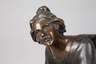 um 1900, unsigniert, Bronze dunkelgrünlich patiniert, elegantes Jugendstilmädchen mit hochgestecktem Haar, im fließenden Kleid, auf einem Bein einen Reifen über dem Boden herumwirbelnd, auf hohem, gekehltem Sockel aus Zöblitzer Granatserpentin, dieser winzigst bestoßen und Montierung des Reifens locker, sonst gute altersgemäße Erhaltung, H Bronze 33 cm, H ges. 49 cm.