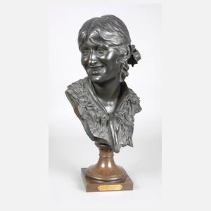 1. Hälfte 20. Jh., auf Plakette bezeichnet ”Offert par la Société Anonyme Belge Chaleur & Lumière à son Administrateur délégué, Monsieur Emmanuel de Valeriola 1892–1922” (Geschenk der belgischen Geheimgesellschaft Chaleur & Lumière an ihren Geschäftsführer, Herrn Emmanuel Valeriola 1892–1922), Bronze dunkel patiniert, Brustdarstellung eines lachenden Mädchens mit keck zur Seite gedrehtem Kopf, auf mehrfach getreppter und gekehlter Plinthe, gute Erhaltung, H 60 cm.