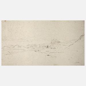 Blick auf das auf einem Felsen thronende Castello Aragonese im Golf von Neapel, mit dem Vesuv im Hintergrund, sparsame, reizvolle Landschaftsschilderung, Grafit auf Büttenpapier, Mitte 19. Jh., unsigniert, rechts unten bezeichnet „Ischia“, Erhaltungsmängel, ungerahmt, Blattmaß ca. 36 x 51,2 cm.