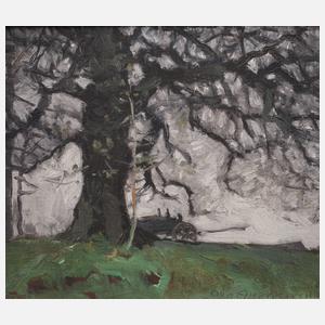 mächtige, stark verzweigte kahle Eiche vor bewölktem Himmel, mit am Stamm platziertem Karren, bereits während seiner Studienzeit ging Otto Altenkirch mit seinem Lehrer Eugen Bracht in die Landschaft bei Siebenlehn und Reinsberg, um zu malen, als der Künstler 1920 nach Siebenlehn in das von seinem Schwiegervater überlassene Haus zog, setzte er sich wiederum bis zu seinem Lebensende intensiv mit der ihn hier umgebenden Landschaft auseinander, pastose Landschaftsmalerei mit kraftvollem Pinselstrich, um 1920–30, rechts unten Ritzsignatur „Otto Altenkirch“, auf Keilrahmen rückseitig nochmals signiert sowie betitelt „Eiche Reinsberg“ und weiterhin teils von der Leinwand verdeckt nummeriert „1924.26“ sowie „ph“, geringe Altersspuren, in ca. 9 cm breiter versilberter Leiste gerahmt, Falzmaß ca. 28 x 33,5 cm, Maße Keilrahmen ca. 25,5 x 30,2 cm. Künstlerinfo: dt. Maler, Zeichner, Graphiker und Bühnenbildner (1875 Ziesar bis 1945 Siebenlehn), 1889–93 Lehre zum Dekorationsmaler in Berlin, hier anschließend als Malergeselle tätig und parallel Zeichenunterricht an der „Freiwilligen Fortbildungsschule“ bei Hugo Händler, Militärdienst und Studienaufenthalt in Osteuropa und Ostpreußen, ab 1897 wieder in Berlin und 1898 Studium an der Hochschule der Bildenden Künste (HBK) Berlin bei Paul Vorgang und ab 1900 bei Eugen Bracht, 1902 Wechsel mit Bracht an die Akademie Dresden und seit 1903 dessen offizieller Assistent, studierte in Dresden neben Bracht bei Emanuel Hegenbarth, 1906 Studienabschluss und freischaffend in Dresden, Mitglied der Künstlervereinigung „Die Elbier“, 1910 Gründungsmitglied der „Künstlervereinigung Dresden“ und leitender Hoftheatermaler (Direktor) am königlichen Sächsischen Hoftheater, 1917 von König Friedrich August zum Professor ernannt, 1920 Umzug nach Siebenlehn und freischaffend in Dresden-Neustadt tätig, beschickte ab 1904 die großen Kunstausstellungen Dresden, Berlin und München, 1941 und 1943 Teilnahme an der Großen Deutschen Kunstausstellung im Haus der Deutschen Kunst München, Mitglied der Dresdner Kunst-Genossenschaft, Quelle: Thieme-Becker, Vollmer, Dressler, AKL, Goldstein, Internetseite zum Künstler und Wikipedia.